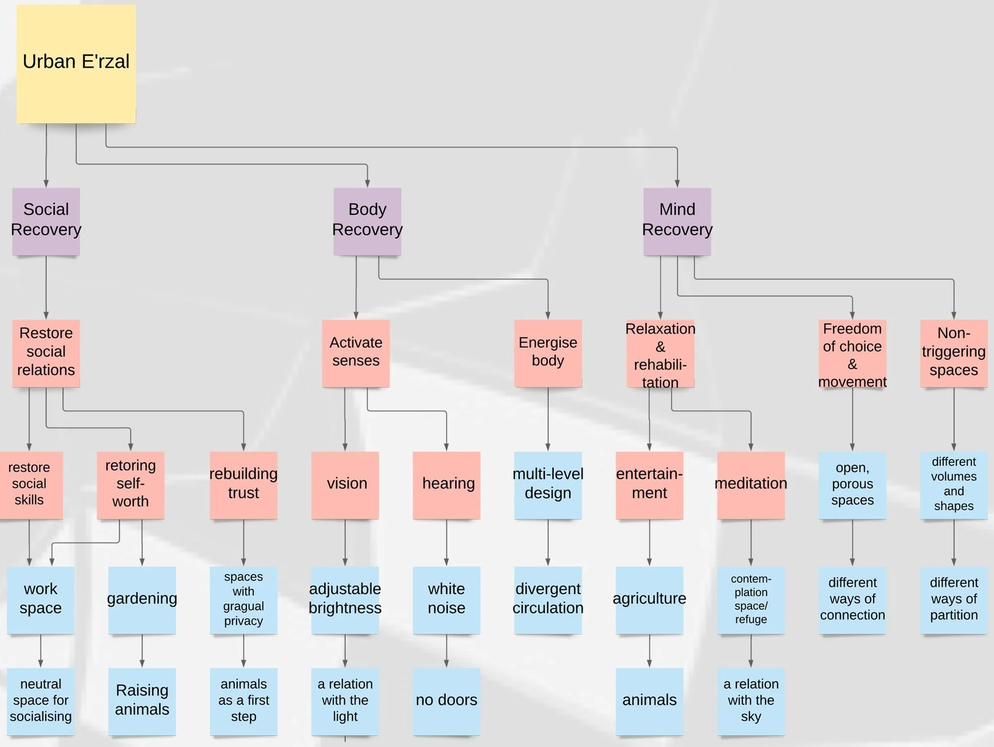 From this comprehensive research, we highlighted three areas of intervention: physical, mental, and social, as demonstrated in the diagram to the right (Prison Experience). Accordingly, we proposed architectural solutions that aim to help Ayman recover and re-integrate in the society, as structured in the diagram below (Urban E'rzal; social recovery, body recovery, mind recovery).
